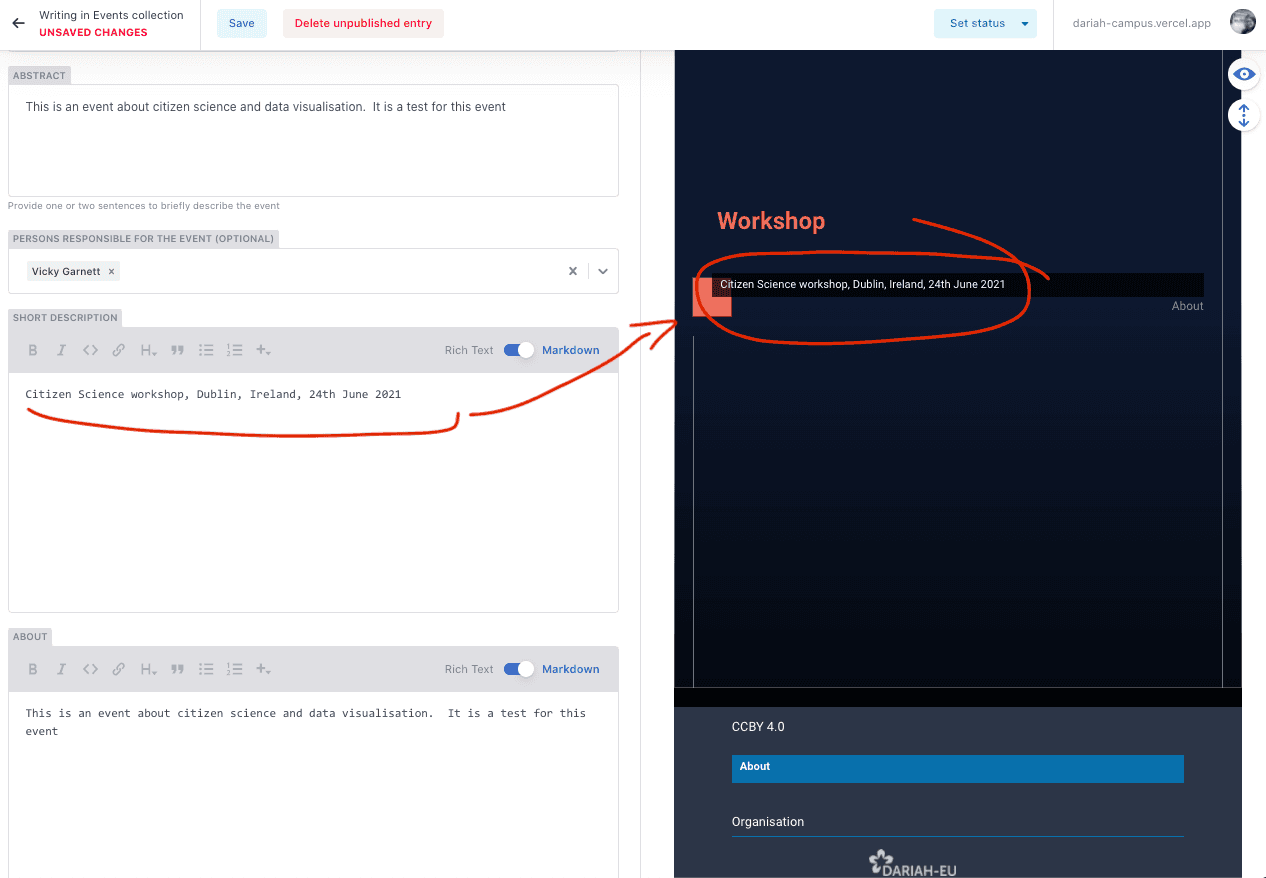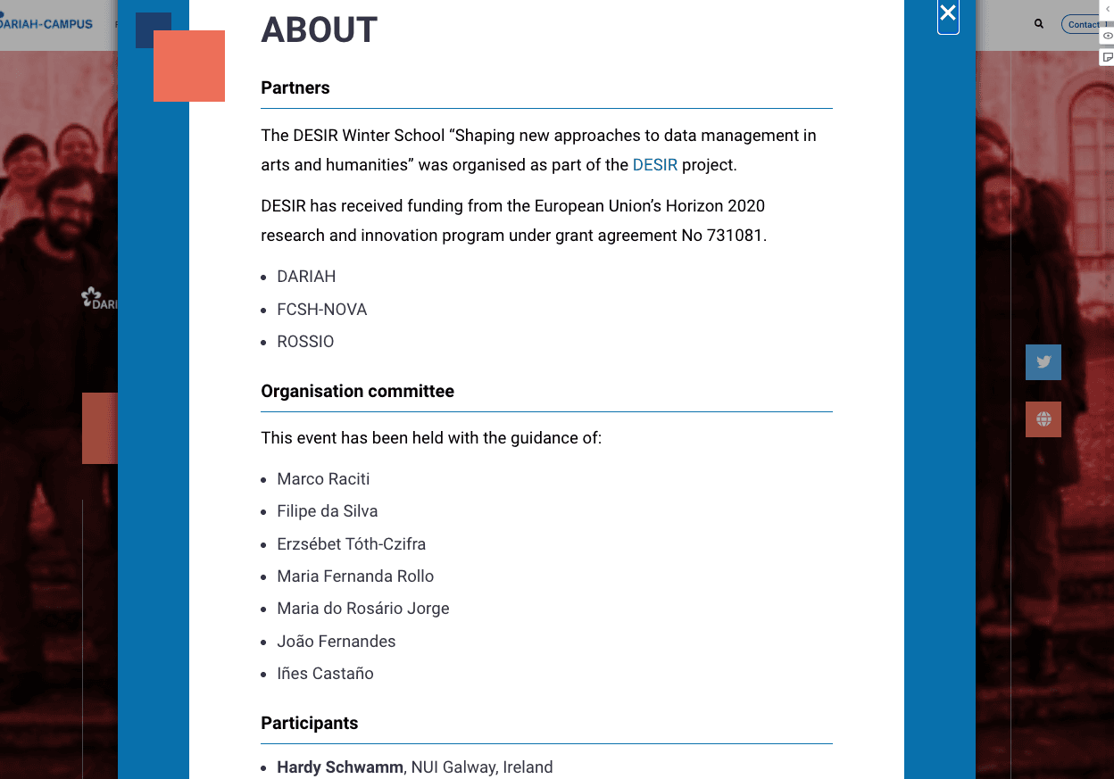 - The ‘About’ field is another field that doesn’t show up in the Preview Pane. This is because this is a pop-up window on the main site. This field can be used to provide a bit more context for the event, give details about the organisation committee, any funding that was received to support the training event, a link to a project website, and if you want to you can also include a list of attendees. An example of this from one of the existing events is given below: