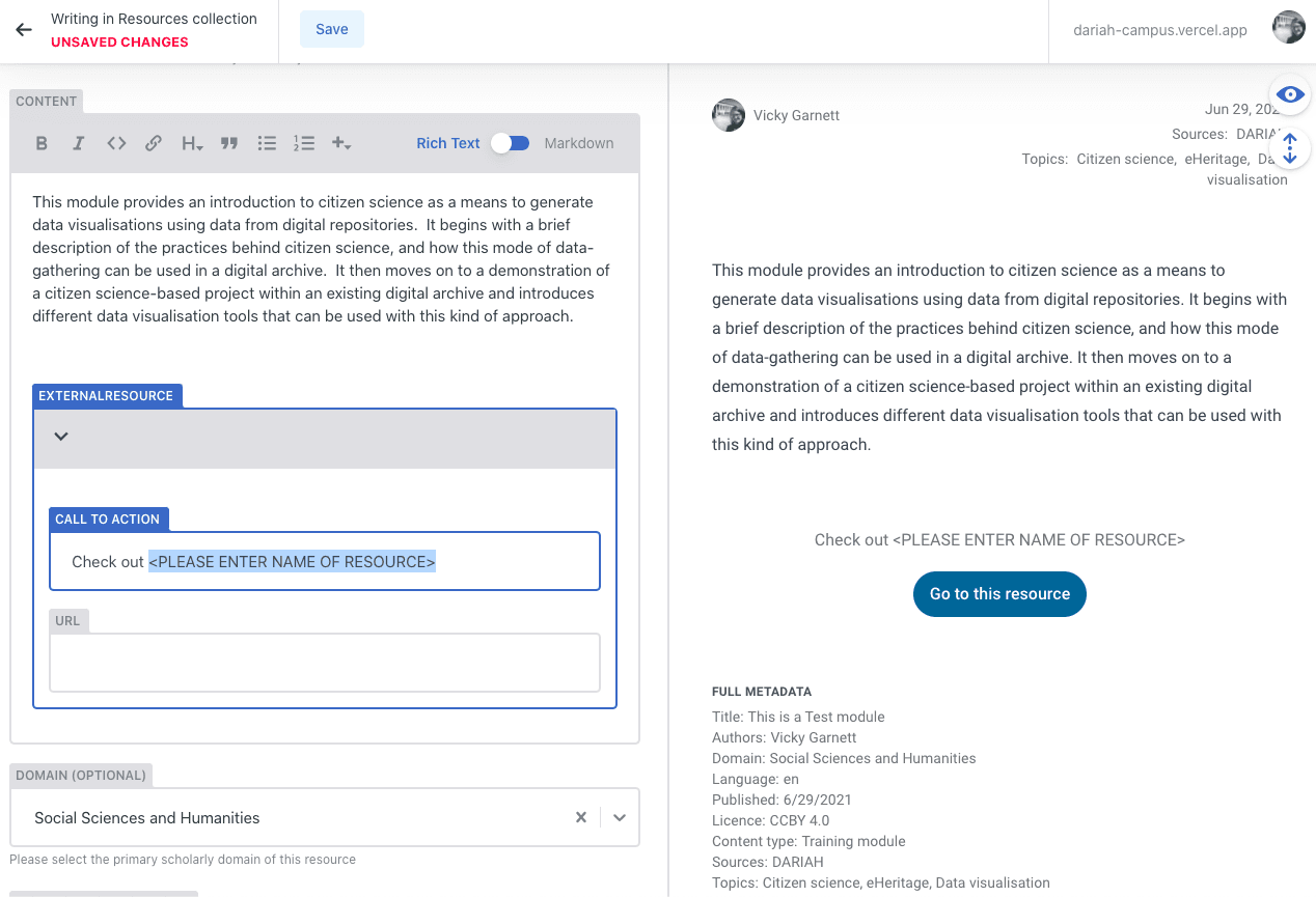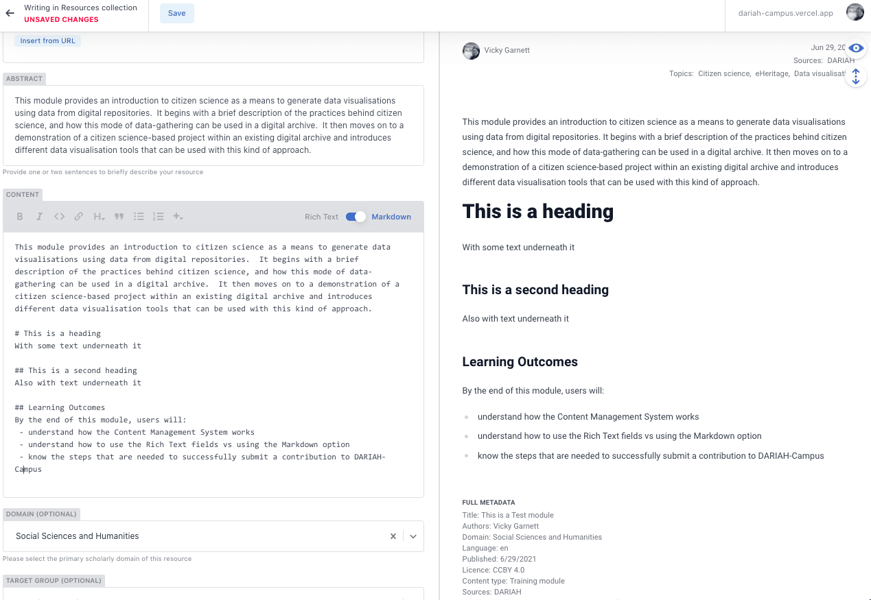 The following walk-through is specific to the Rich Text option, but even if you choose to use Markdown, there are some requirements. These are listed at the end. Users can toggle between Rich Text and Markdown, which can be a useful feature, particularly when it comes to the resource type templates.