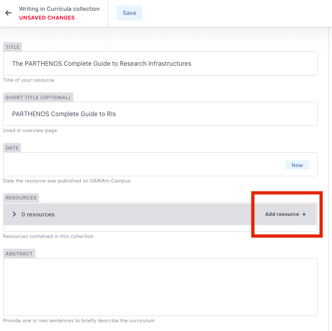 - The ‘Abstract’ is a required field, as this is what shows up in the listings of resources on the main DARIAH-Campus page. You will not see a preview of this here, so it’s important that you make sure everything in this is correct, check for any spelling errors and/or typos. The abstract should be no longer than around 50 words, and should indicate to a potential student what they will learn within the resource.