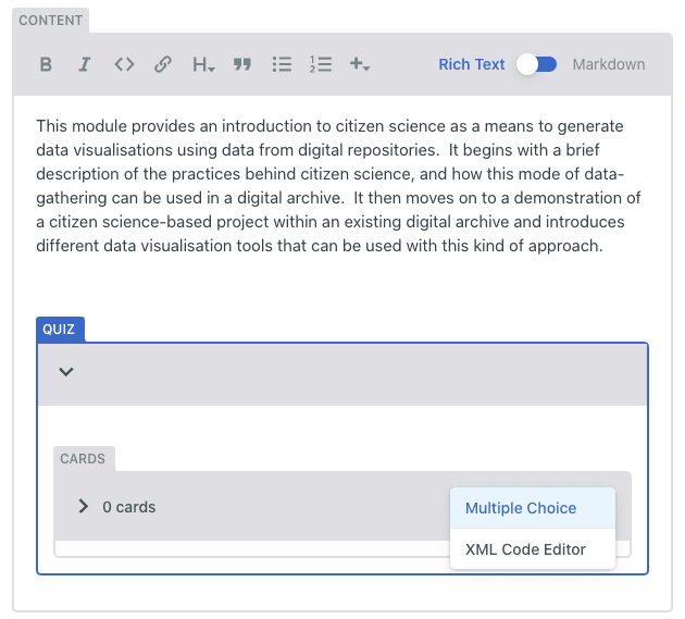 The ‘Quiz’ option allows you to create a quiz or self-assessment either at the end of a section or the end of the entire resource. The current options available are either to ask questions with multiple choice answers, or to create something using an XML code editor. If you are not confident in using code, we recommend that you try to format your questions to Multiple Choice to keep it simple.