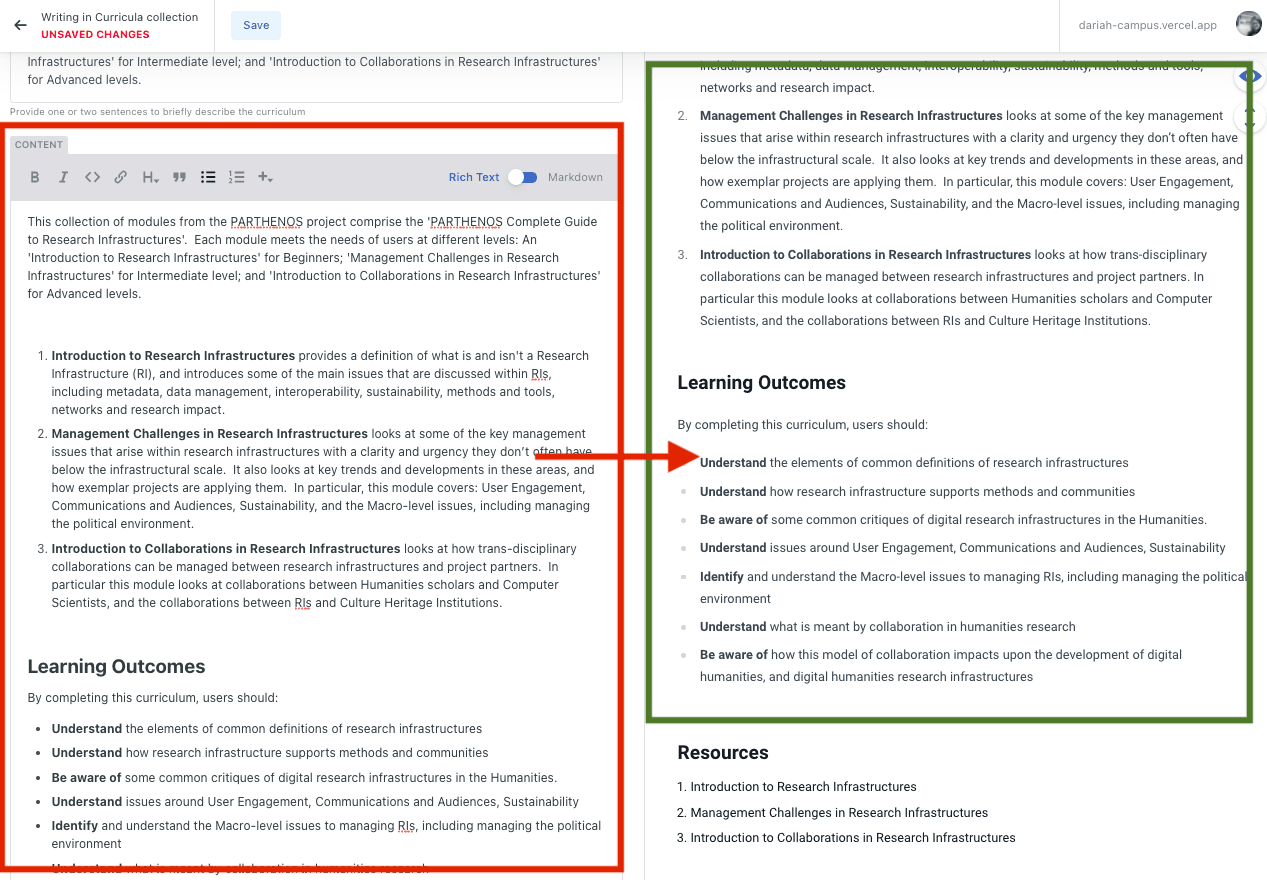 If you prefer to use Markdown to write your content, this is also possible. There is still the same requirement for entering Learning Outcomes (a markdown version is available above for reference).