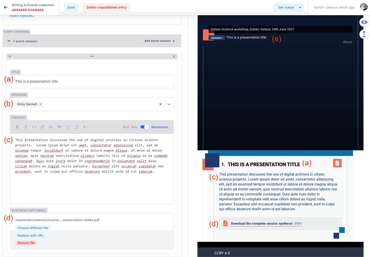 - This will bring you to a page with a form with two columns: a form on the left hand side, and a preview panel on the right. As you add items, you will see that the preview panel will start to display them so you can see how they will show up on the main DARIAH-Campus site.