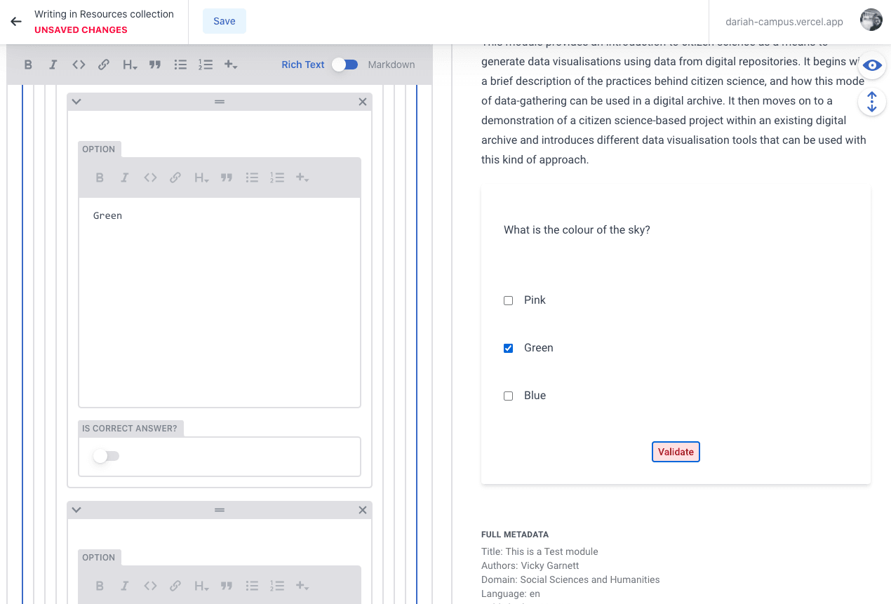 You can test if your quiz is working in the Preview Pane by selecting one of the responses and clicking the ‘validate’ button. If the answer is correct it will turn green, if it’s wrong, the button will turn red. It is probably worth adding a ‘side note’ here to let users know this (see above).