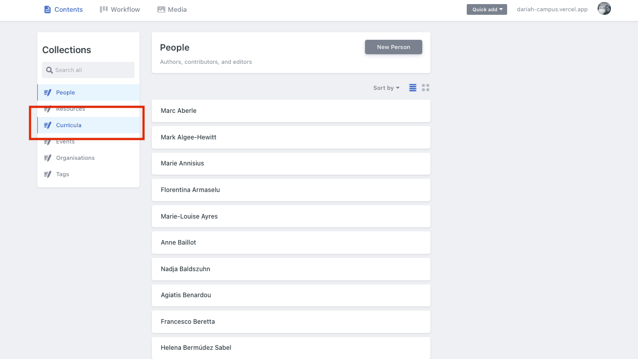 The first thing you will see here is the ‘People’ tab, and the option to create a ‘new person’. Ideally you will have already completed step one, and therefore will not need to do this. However, be sure to scroll down through the list to check that all your authors are in this list. This is a good opportunity to add an image to their profile as well, so that this appears on the DARIAH-Campus listing properly.