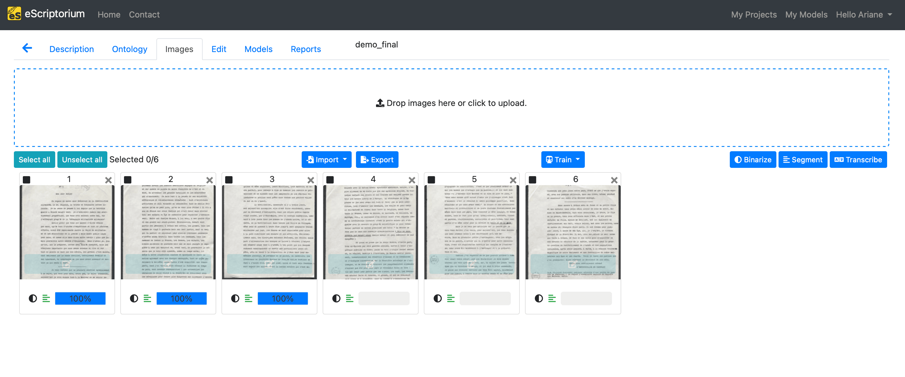 Once your images are optimised, you upload them onto a transcription platform. In this training module series, we use the French platform, eScriptorium. However, the process is the same when using other platforms such as Transkribus or OCR-D. Moreover, there is no difference between transcribing images of handwritten manuscripts and printed text.