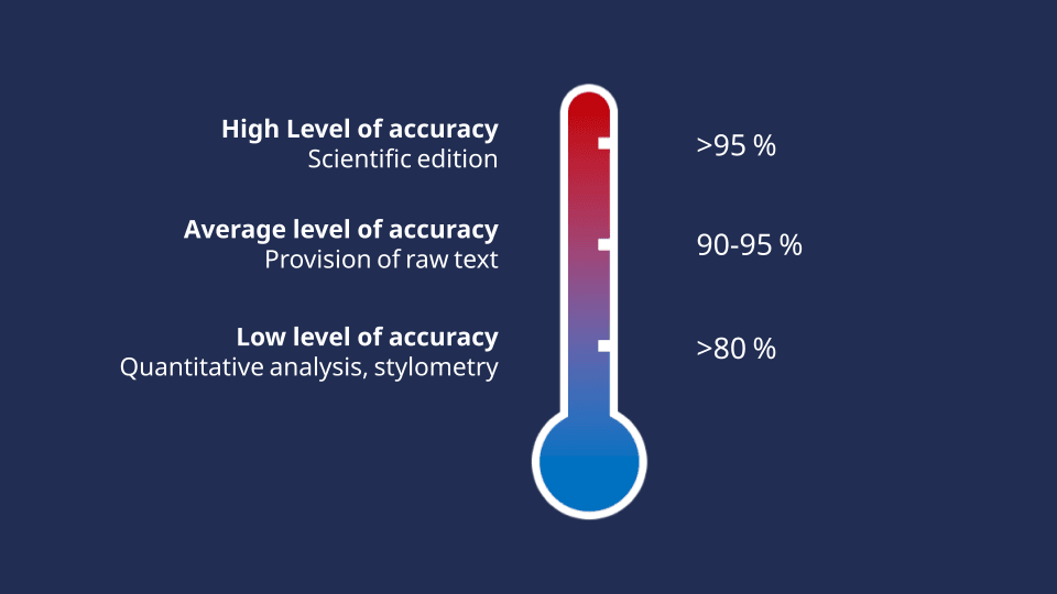 For a scholarly edition, an accuracy rate of over 95% is required. For the provision of raw text, an accuracy rate of over 90% is sufficient, while statistical analyses can be carried out using a model offering 85% accuracy.