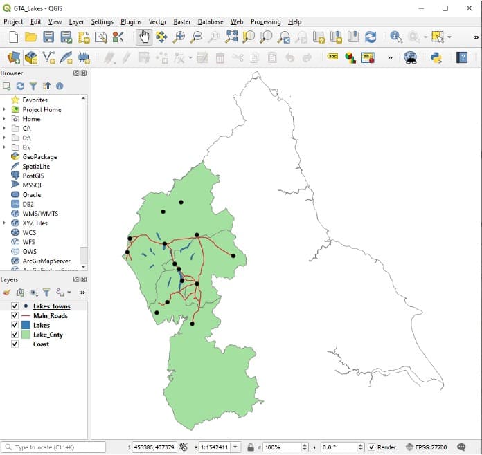 - Click Add within the Data Source Manager. QGIS will then ask you which Layers you would like to add. Select all those that appear within the ‘QGIS-Shapefiles’ folder, as follows: (Coast.shp; Lake_Cnty.shp; Lakes.shp; Lakes_towns.shp; Main_Roads.shp)