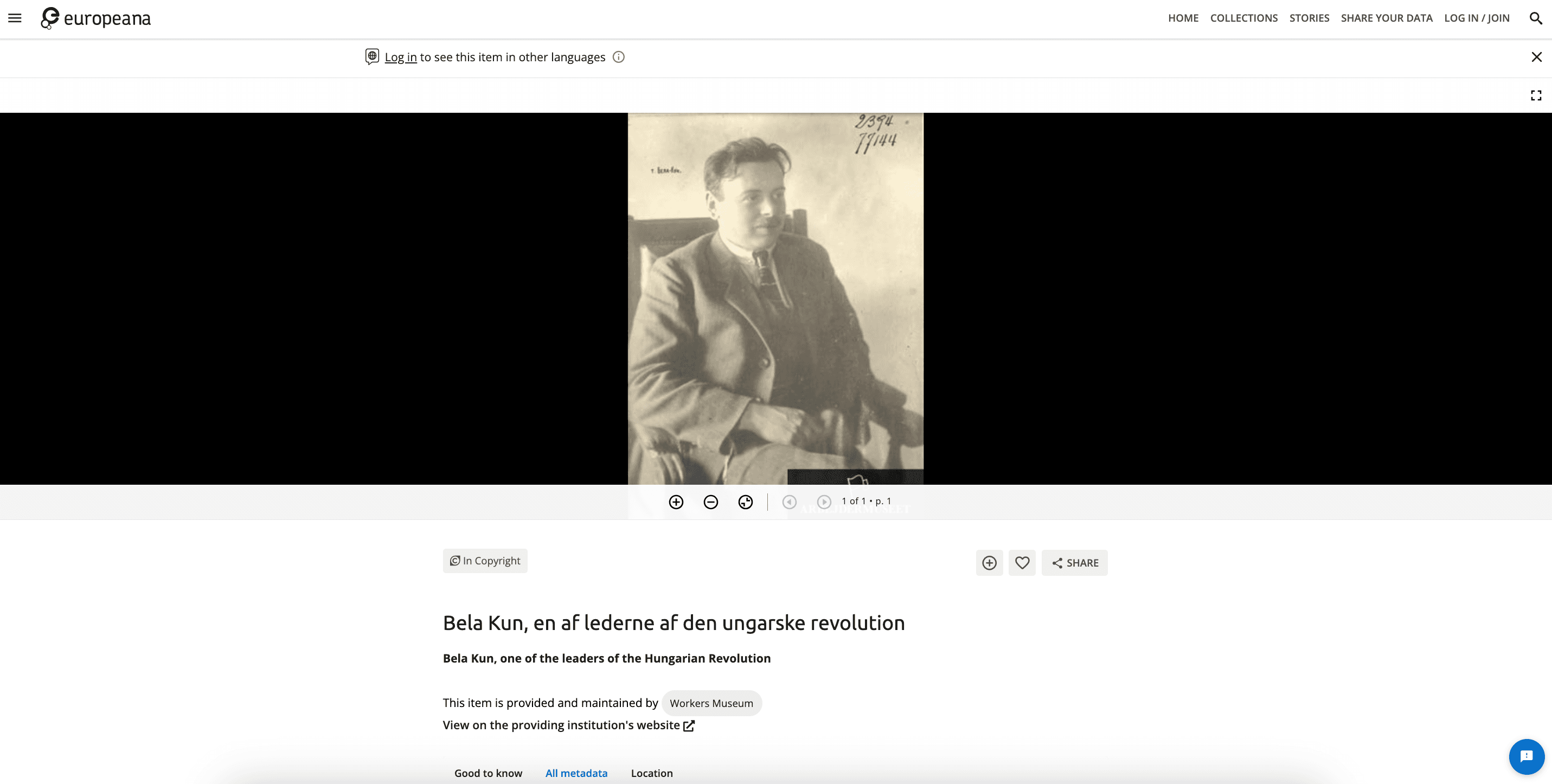 For instance, looking deeper into Costis’ dataset, Prof. Lorena selects two different objects from the Europeana results related to the same topic: an image provided by the Workers Museum depicting Bela Kun (illustrated in Fig.2), one of the leaders of the Hungarian Revolution, and a text containing a speech by the same person (illustrated in Fig. 3). Using these two records, which are related to the same person, she explains to Costis the importance of documenting this information not by plain text, but by representing this person as an entity. By doing so, all records associated with that person can be related to this entity, resulting in a rich representation of all the available information about Bela Kun.