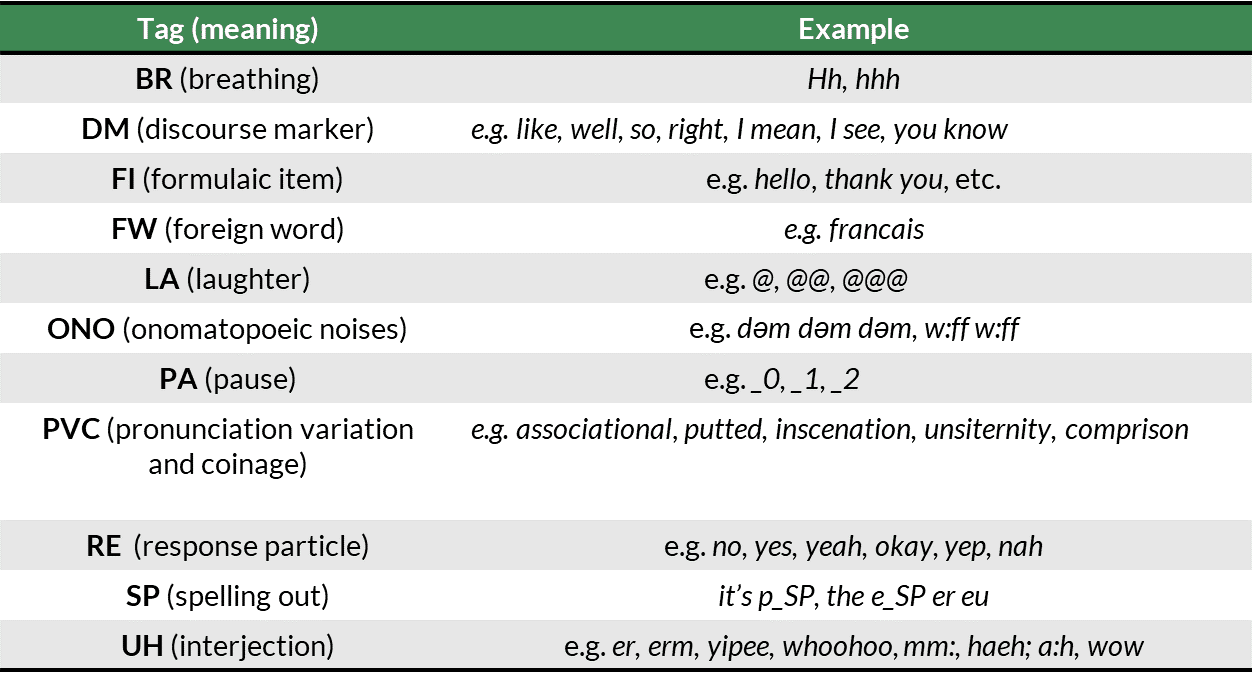 Detailed examples for mark-up searches are provided in section 6 of the VOICE 3.0 Online search manual. The VOICE tagging scheme has been said to be especially strong in displaying features typical of spoken language. This is possible because already during the early stages of the corpus compilation, it was decided to add additional tags to the PENN Treebank tagset to represent spoken features in the corpus. The following illustration shows some examples of spoken features that have been tagged and thus allow powerful searches in VOICE:
