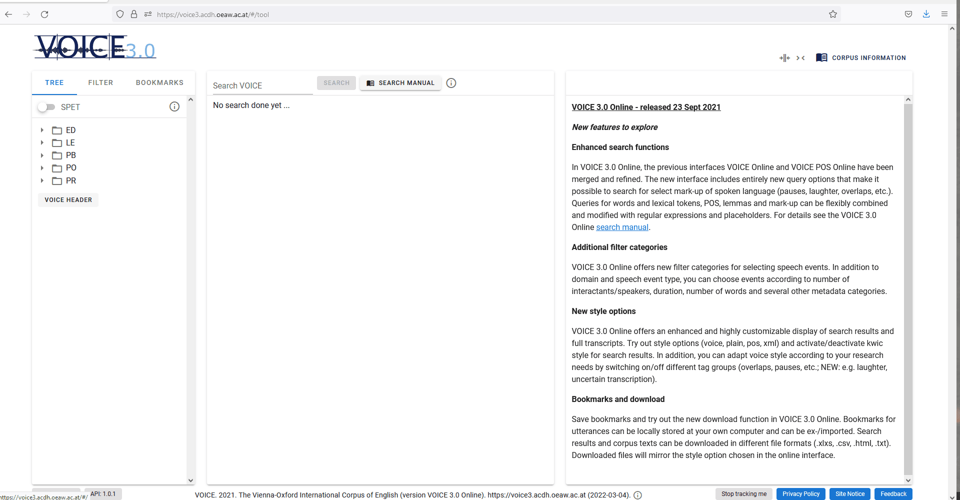 - Osimk-Teasdale, Ruth; Pirker, Hannes; Pitzl, Marie-Luise. 2021. Search manual for VOICE 3.0 Online. https://voice.acdh.oeaw.ac.at/wp-content/uploads/2021/09/Search-manual-VOICE-3.0-Online.pdf. (14 March 2022).